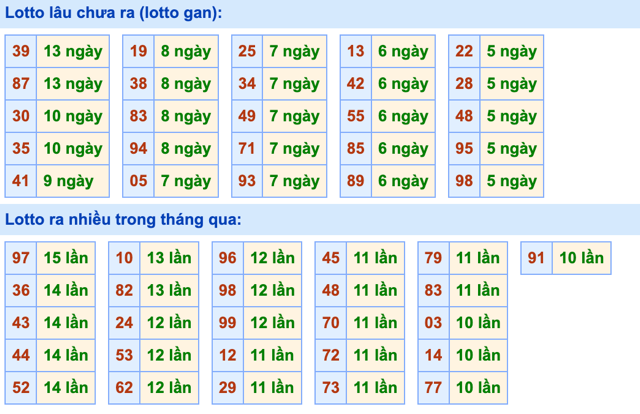 Dữ liệu chúng tôi phân tích tiếp theo đó chính là lô gan. Nếu anh em chơi lô đề hàng ngày thì không thể bỏ qua việc phân tích lô gan lâu chưa ra. Sau đây mời anh em cùng theo dõi những con lô gan lâu chưa về ở bảng bên dưới.